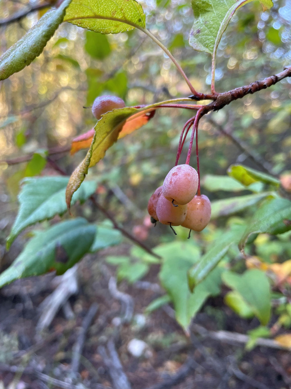The Pacific Crabapple is a small tree with a big role in the forest. It is found along wetland edges and can be up to 12 meters in height. The flowers are fragrant apple blossoms. There are sharp spurs along the branches. This years bumper crop has been discovered by the Stellars Jay, Robins and woodpeckers.